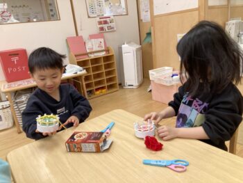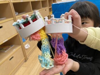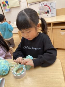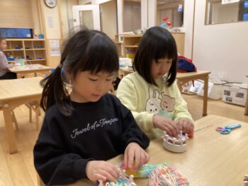 何作る? 2026年01月08日 【4歳児クラス】 クリスマスにサンタさんから貰った『毛糸deリリアン』 好きな色の毛糸で集中して作っています。 「たのしい」と言いながらどんどん編んでいき・・ 「ながくなってきた!」と友だちと長さ比べ 途中で色を変えてみたりアレンジをして楽しんでいます♪ 毛糸が減ってきたので今度皆で買い物に出かけ 自分達の好きな色の毛糸を買いたいと思います!! ✨どんな物が出来上がるのか楽しみです✨