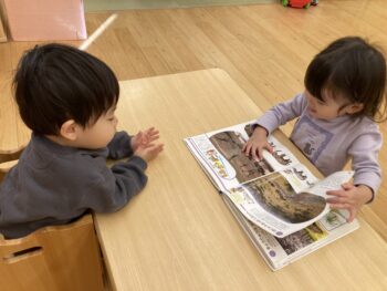 仲良く同じ遊びをする乳児クラスのお友だち