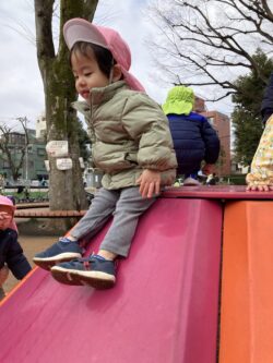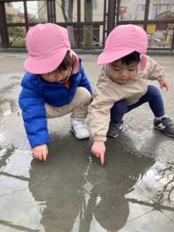 雨上がり 2026年02月17日 【1歳児クラス】 今日はちょっと遠くの子ども達が大好きな公園へ行ってきました。 昨日の雨で水溜まりができているのに気づいたお友だち♪ ちょっと触ってみたよ!ツンツン「つめたい~」 全クラス同じ公園だったので大きいクラスのお友だちも 一緒に遊んでくれました。 「だいじょうぶ?」と優しく声を掛けてあげる姿も見られました。