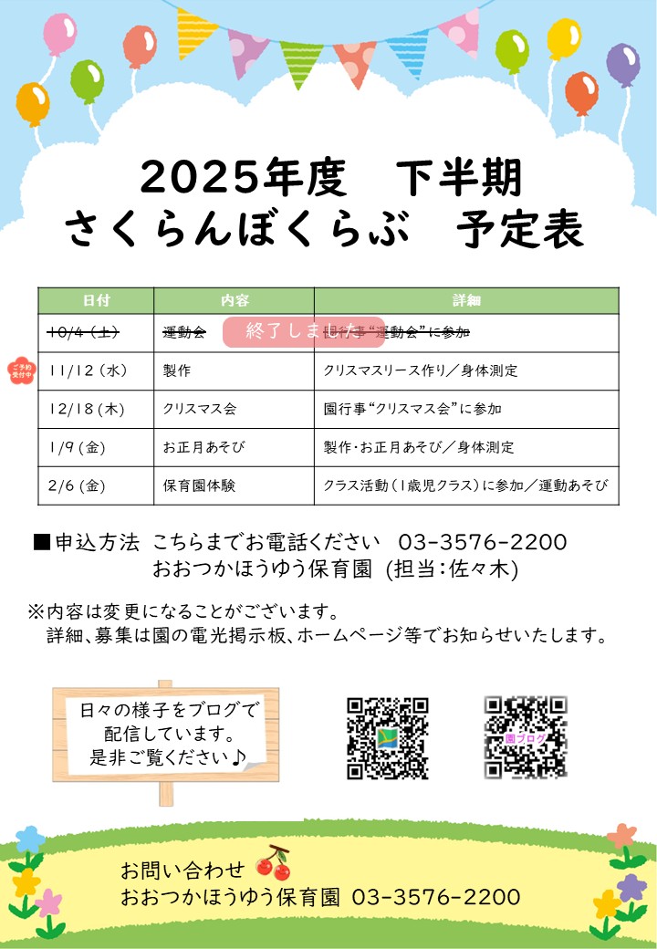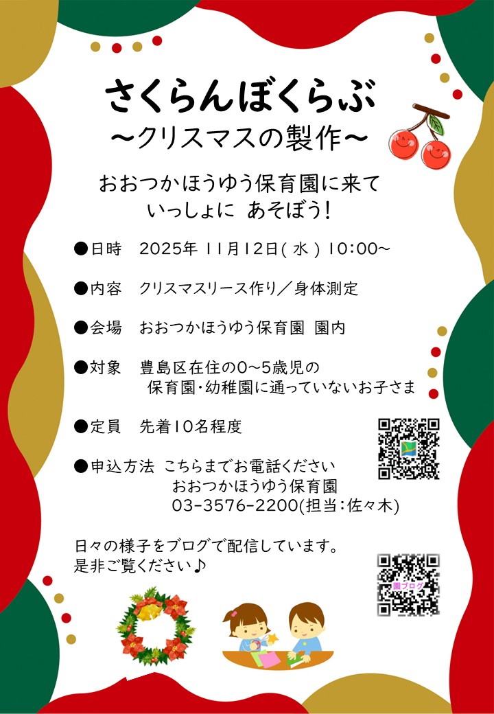11月さくらんぼくらぶ 参加者募集♪ 2025年10月15日 11月のさくらんぼくらぶのお知らせです! 11月はクリスマスリースの製作をします🌳🎅 先生やお友達と一緒に可愛いリースを作りましょう♪ みなさまのご参加をお待ちしております♪